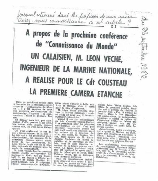 Mais la caméra n’est pas tout. Il faut inventer le caisson étanche pour la loger. C’est avec Léon Vèche, son ami ingénieur mécanicien de la Royale, et génial bricoleur touche à tout, qu’il conçoit ce caisson. Léon Vèche, avec des moyens de fortune, confectionne un caisson étanche en laiton, dont les commandes de mise au point et d’ouverture du diaphragme se font par l’intermédiaire de presses étoupes, tandis que le déclenchement s’effectue à l’aide d’une commande souple.
