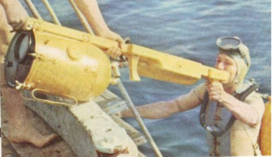 Jacques-Yves Cousteau équipé d’un caisson pressurisé Cousteau-Girardot