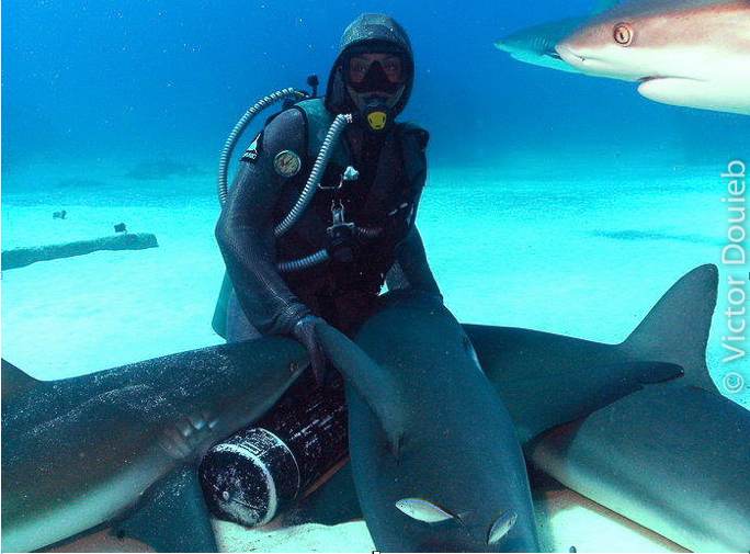 Les requins des Caraïbes sont des animaux avec lesquels Cristina à l’habitude de travailler. Timide de nature, ils le deviennent moins en présence de nourriture et ce qui leur permet de se rapprocher d’un plongeur. Ils sont capables de reconnaître que les autres plongeurs n'ont pas de nourriture et de garder une distance de sécurité.
