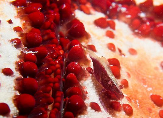 Et puis, s’il n’y a plus de poissons à déranger, on peut toujours s’attarder sur d’autres sujets, tels les crinoïdes ou la bouche d’une étoile de mer, avec une crevette Periclimenes soror en bonus, pourquoi pas…