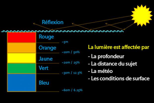 La lumière a donc une portée limitée, alors pourquoi ne pas … porter la lumière plus loin. Il faut imaginer que le flux lumineux, pour imprimer votre capteur, doit faire deux fois la distance qui vous sépare du sujet, une fois pour aller de votre phare au sujet, le sujet réfléchit alors la lumière, qui doit donc refaire le trajet vers votre caméra. A partir de ce constat, pourquoi ne pas travailler en binôme ? Puisque les phares à Led se généralisent dans les poches des stabs, apprenez à votre binôme à devenir éclairagiste. Pour les plans larges, un plongeur qui se balade avec son phare à la main et éclaire ce qu’il voit permet de marquer le centre d’intérêt et de suggérer au spectateur d’orienter son regard, ne pas hésiter à jouer d’un coup de contre jour franc, en plein axe caméra, une manière de réveiller le public, et puis à plus d’un mètre de distance du sujet, si vous mettez dans le cadre un plongeur qui éclaire le sujet principal, vous allez voir que la lumière porte alors que celle de votre propre caméra ne sert déjà plus à rien.