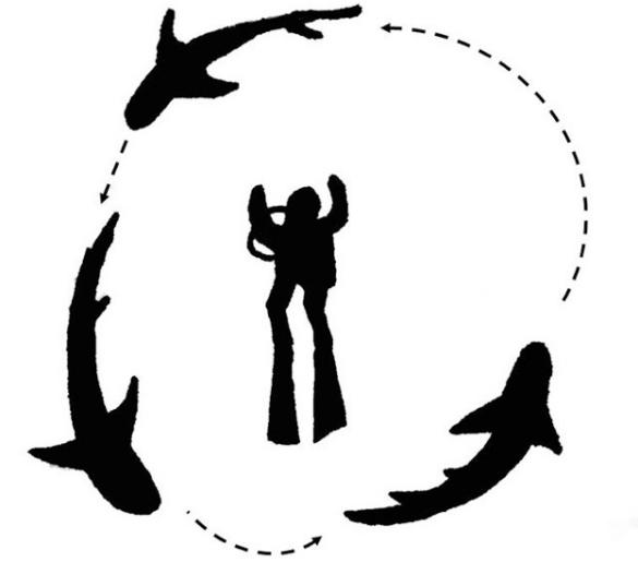 Lorsqu’un prédateur supérieur se trouve au-dessous de sa proie, il est en situation d’observation. Il tourne au-dessous de la zone d’évolution de sa proie ou d’un animal/objet inconnu afin de prendre connaissance de ce qui a suscité son intérêt. Il ne se rapproche pas mais recueille toutes les informations qui lui sont nécessaires pour comprendre les intentions du protagoniste. Dans ces phases d’approche, le requin n’a pas de limite spatiale, il peut disparaître à tout moment, quand il le souhaite.