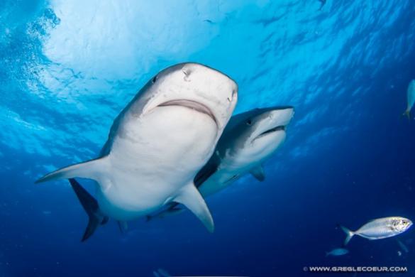 Aux Bahamas, le contexte est différent. Eaux turquoises, visibilité de 30m, profondeur d’évolution 6m, lieux de plongée : fond de sable sous le bateau. La technique des appâts reste sensiblement la même, à savoir une boîte métallique remplie de carcasses plongée dans le courant afin d’attirer les requins. Cette zone est une aire de repos pour les femelles pleines avant de mettre bas, loin du large pour que les juvéniles soient à l’abri des prédateurs. Ici, même combat. L’odeur attire d’autres requins, des requins citrons (Negaprion brevirostris) ainsi que des requins gris des caraïbes (Carcharhinus perezi), parfois. Le comportement des femelles requins tigres est lent, décontracté et sans aucune agressivité.