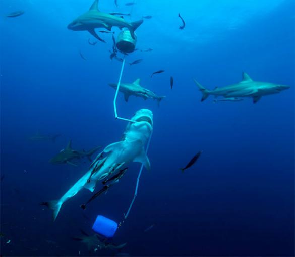 Lors d’un Feeding, un ou plusieurs requins tigres sont attirés par le fumet de la nourriture. Leur motivation est de se nourrir. Aucun amalgame n’est fait entre les plongeurs et l’appât. Les requins accepteront rapidement la présence des hommes au point des les ignorer. Si la situation dégénère, les bateaux sont toujours au-dessus.