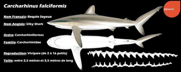 Le requin soyeux est le requin le plus svelte. Son dos gris foncé/bronze présente parfois des reflets soyeux, d’où son nom. La surface ventrale est blanche, une bande latérale blanchâtre se prolongeant sur la tête. Il est souvent confondu avec le requin requiem (Carcharhinus plumbeus). Ce qui le caractérise est la hauteur relativement faible de sa première nageoire dorsale et le bord arrière extrêmement allongé de la seconde. La première nageoire dorsale prend son origine derrière les pointes postérieures libres des nageoires pectorales. Il se distingue également par son long museau arrondi et la forme en faucille de ses nageoires pectorales. Il peut vivre jusqu'à 25 ans. À ne pas confondre avec le requin gris de récif (carcharhinus amblyrhincos), le requin bordé (carcharhinus limbatus) ou le requin cuivre (carcharhinus brachyurus).
