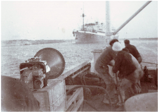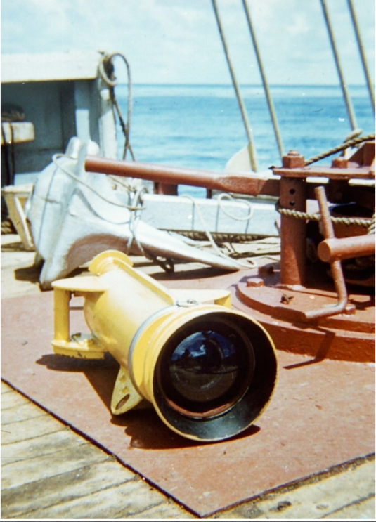 À gauche, la caméra cinémascope sur le pont de Calypso en 1954