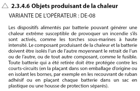 Le règlement de l’IATA (Association du transport aérien international) relatif aux marchandises dangereuses fournit des instructions très claires à l’article 2.3.4.6. Objets produisant de la chaleur.