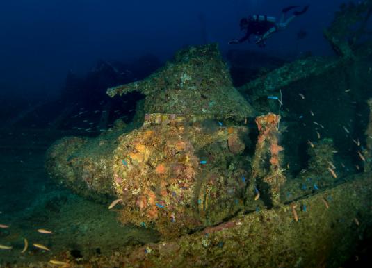 Il dispose d’un nombre considérable de tanks, camions, mines et bombes et également une faune riche de bancs de poissons à découvrir en plusieurs plongées.
