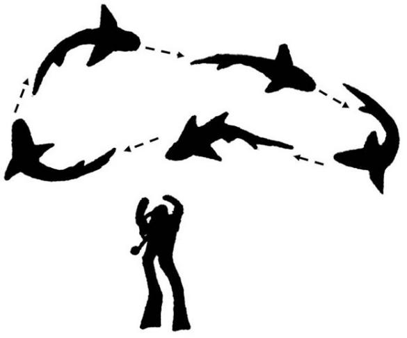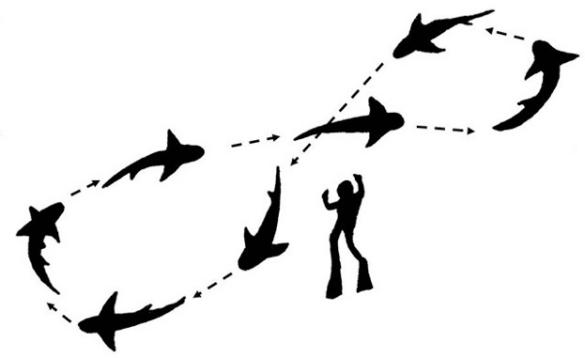 Lorsqu’un prédateur supérieur se trouve au-dessous de sa proie, il est en situation d’observation. Il tourne au-dessous de la zone d’évolution de sa proie ou d’un animal/objet inconnu afin de prendre connaissance de ce qui a suscité son intérêt. Il ne se rapproche pas mais recueille toutes les informations qui lui sont nécessaires pour comprendre les intentions du protagoniste. Dans ces phases d’approche, le requin n’a pas de limite spatiale, il peut disparaître à tout moment, quand il le souhaite.