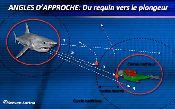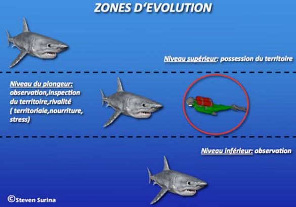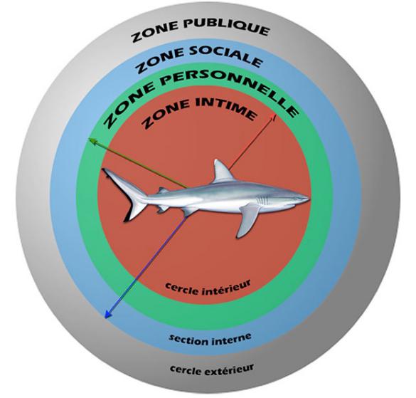 Nous retrouvons sensiblement les mêmes sphères d’évolution chez les requins, avec des distances différentes en fonction des espèces. D’une manière générale, c’est le requin qui décidera ou non de l’approche par rapport aux signaux envoyés par le plongeur. Si un plongeur se rapproche d’un requin sans y avoir été « invité » ou sans que le requin s’y soit préparé, il peut faire fuir l’animal. Les phases d’approche des requins, sans autre stimulus, sont longues et complexes. Lors d'une interaction, elles prennent nécessairement en compte les différentes sphères avec tout ce qu’elles impliquent.