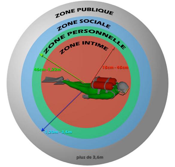 L’homme ressent la distance de la même manière que les autres animaux. Sa perception de l’espace est dynamique parce qu’elle est liée à l’action, à ce qui peut être accompli dans un espace donné. La frontière physique de notre corps, la peau, n’est pas notre limite par rapport au monde environnant : nous nous déplaçons, une partie de l‘espace accroché à nous, sorte de bulle invisible, qui règle nos contacts avec autrui sans que nous en ayons conscience. Il s’agit de la zone intime, personnelle, de la zone sociale et publique.
