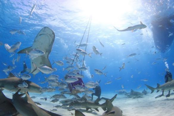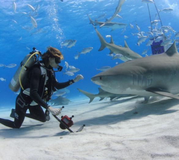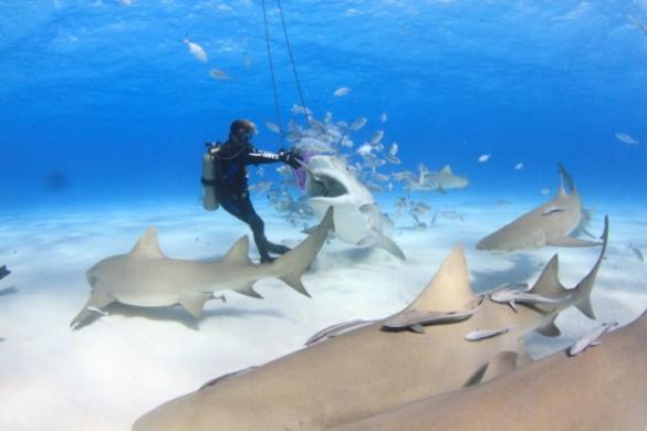 Aux Bahamas, le contexte est différent. Eaux turquoises, visibilité de 30m, profondeur d’évolution 6m, lieux de plongée : fond de sable sous le bateau. La technique des appâts reste sensiblement la même, à savoir une boîte métallique remplie de carcasses plongée dans le courant afin d’attirer les requins. Cette zone est une aire de repos pour les femelles pleines avant de mettre bas, loin du large pour que les juvéniles soient à l’abri des prédateurs. Ici, même combat. L’odeur attire d’autres requins, des requins citrons (Negaprion brevirostris) ainsi que des requins gris des caraïbes (Carcharhinus perezi), parfois. Le comportement des femelles requins tigres est lent, décontracté et sans aucune agressivité.