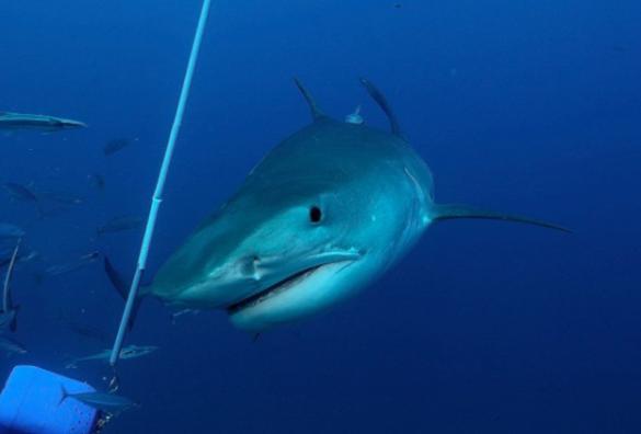 En Afrique du Sud, ce type de plongée s’effectue en dérivante, une trentaine de mètres sous nos palmes. Un tambour de machine à laver est rempli de 20kg de bouillie de sardines à une profondeur de 6 à 8m et un second bidon plus petit est disposé entre 10 et 12m, l’intérêt étant de créer un couloir olfactif permettant au requin de remonter le flux jusqu’à sa source. En plus d’attirer les requins tigres, les odeurs attirent également requins bordés (Carcharhinus limbatus) et parfois du requin bouledogue appelé là-bas requin du Zambèze (Carcharhinus leucas). Contrairement aux idées reçues, les requins tigres ne sont pas les premiers sur zone et vont laisser le territoire aux plus petits requins. Pendant ce temps, il(s) va(vont) nager au niveau du second bidon, au-dessous de nous, en arcs de cercles, à la limite de notre champ visuel qui, en raison de la faible visibilité, est réduit. Très timide, ce requin va d’abord observer. Parfois il disparaît pour réapparaître derrière nous, hors du contact visuel qui le gêne.
