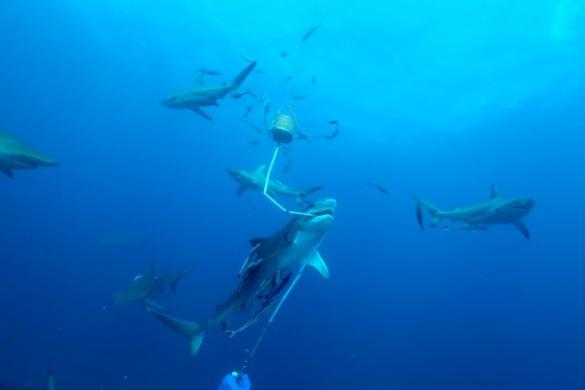 Lors d’un Feeding, un ou plusieurs requins tigres sont attirés par le fumet de la nourriture. Leur motivation est de se nourrir. Aucun amalgame n’est fait entre les plongeurs et l’appât. Les requins accepteront rapidement la présence des hommes au point des les ignorer. Si la situation dégénère, les bateaux sont toujours au-dessus.