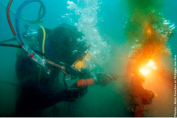 Notre troisième journée de reportage sera consacrée aux « Trasoum », autrement dit les travaux sous-marins, qui non seulement entrent dans les attributions du GPD, mais dont c’est de plus la spécialité. Nous rejoignons l’appontement au pied duquel différents travaux de soudure et d’oxycoupage doivent être réalisés. Une fois encore, l’ambiance est surréaliste : crépitements du chalumeau entrecoupés d’éclairs et grondements presque assourdissants des bulles composent un décor complètement inhabituel. Encore une autre facette du métier, et les missions dans ce domaine sont nombreuses et variées. Il faut savoir qu’outre les activités de déminage à proprement parler, la mise en œuvre d’explosifs (pour contre-minage par exemple), les travaux sous-marins, les plongeurs démineurs interviennent également à la suite de naufrages et participent à la recherche des disparus en mer, ainsi qu’à la destruction de containers dérivants et présentant un danger pour la navigation, ou encore à l’élimination sur demande du Préfet Maritime de carcasses de cétacés échoués ou tués lors d’abordages avec les ferries par exemple.
