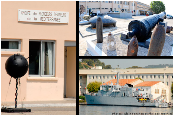 Qu’en est-il aujourd’hui ? Nous avons suivi Christopher, Plongeur Démineur au 3ème GPD lors d’une mission d’entraînement au large de Toulon. Trois jours ordinaires dans la vie d’un plongeur pas ordinaire. Nous rejoignons l’arsenal où après les inévitables contrôles de sécurité, nous sommes accueillis par Christopher, Romain et Julien, qui nous amènent au bâtiment qui abrite les locaux du 3ème GPD. Celui-ci est entouré d’une riche collection d’objets explosifs en tous genres : mines à orin, rockets, missiles, canons, etc… Depuis leur création, les trois GPD ont développé un ou plusieurs domaines d’excellence. Ainsi, le GPD Manche, basé à Cherbourg, est-il spécialisé dans le dépiégeage d’assaut dans le cadre du contre-terrorisme maritime, alors que le GPD Atlantique de Brest opère sur les mines inconnues et les interventions en eaux polluées. Le GPD Méditerranée de Toulon intervient dans les travaux sous-marins et le VSW (Very Shallow Water), qui consiste en des opérations de déminage de port, accompagnées d’un traçage de chenal destiné à sécuriser l’accès à une zone de mouillage en cas de conflit par exemple.