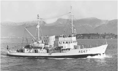 [4] Vedette de patrouille équipée pour la plongée en scaphandre lourd et en scaphandre autonome. Le commandement de cette vedette était assuré au G.E.R.S. par le Premier Maître Maurice FARGUES. Elle a été mise à disposition pour la mission de déminage.