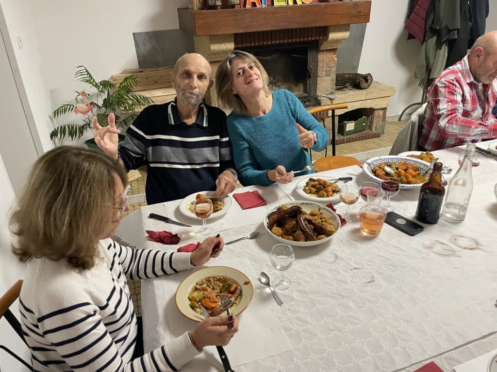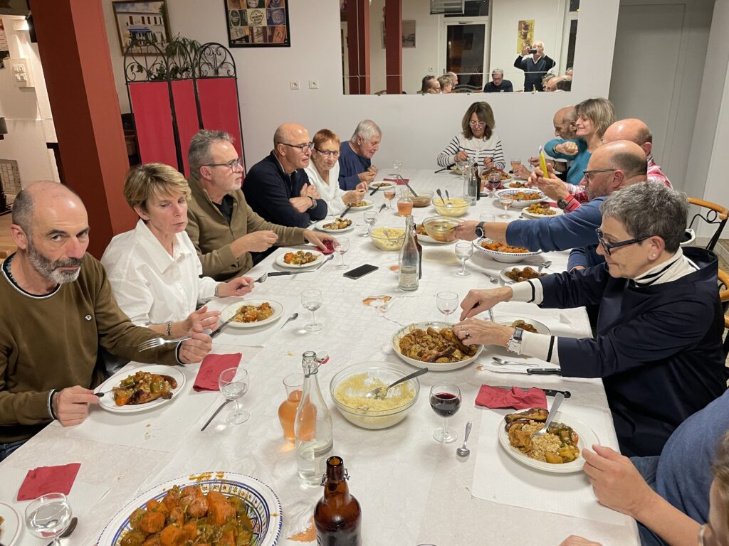 Gaby nous a proposé un apéritif maison (punch) accompagné de petites quiches, omelette etc…. S’en est suivi un excellent couscous très (trop) copieux et en dessert le choix entre tarte aux pommes et fonDant au chocolat.